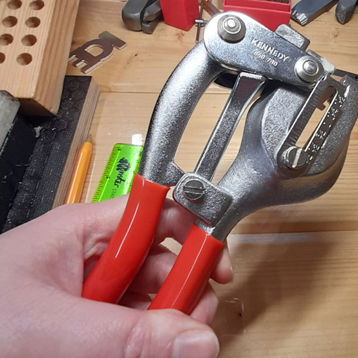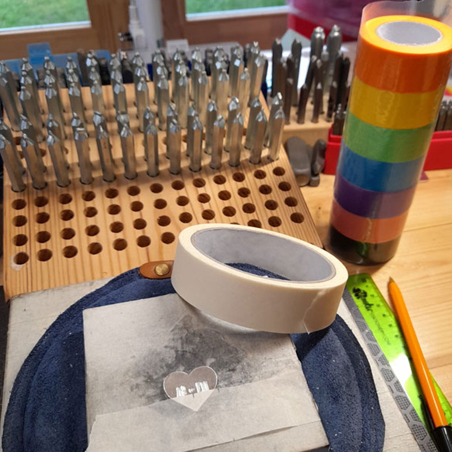 When metal stamping, each letter, number and design stamp is placed onto the metal blank and then gently hit with a hammer to leave an impression in the metal that can then be coloured.