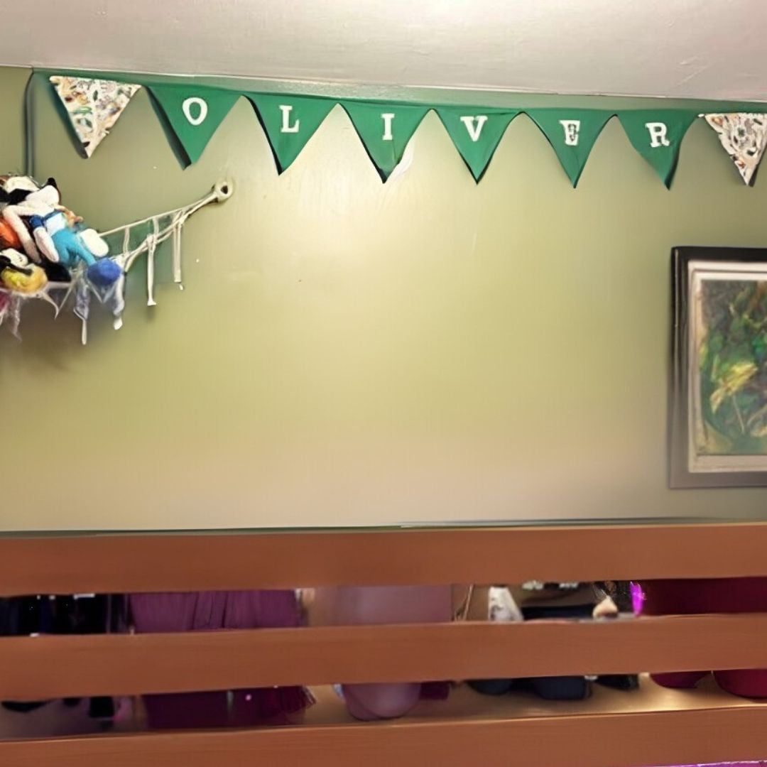 My bunting is made up of flags, each which feature appliqué letters to spell out names, messages, or special notes. It’s made using a technique which involves sewing fabric letters onto the flags, to create a personalized and unique decoration.