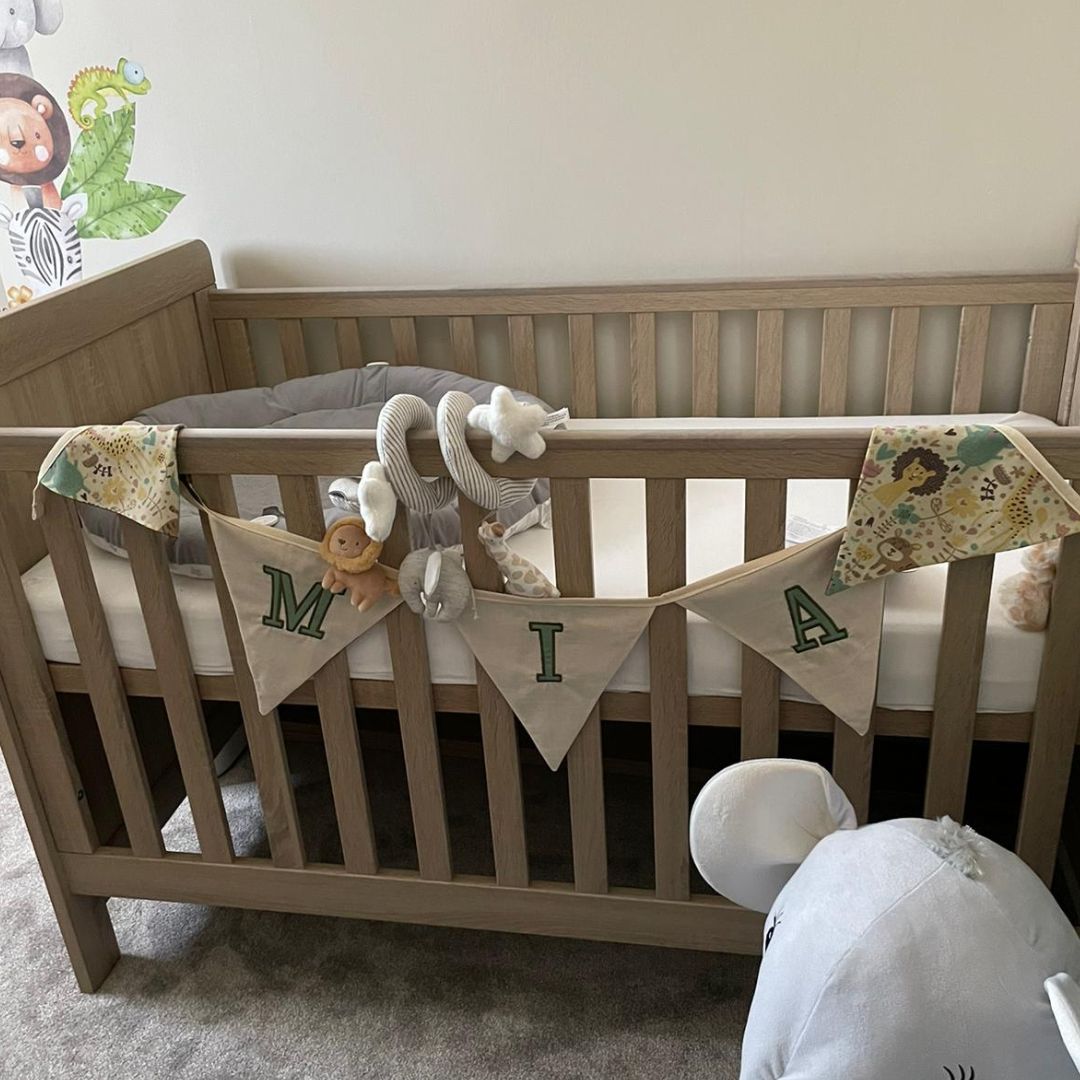 Bunting is a decorative string of flags, often used for nursery decoration, celebrations or to add a festive touch to a space.