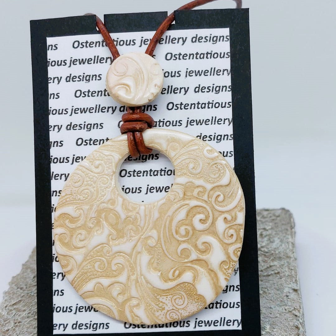 Introducing this elegant handmade polymer clay pendant. A round-shaped masterpiece that embodies timeless allure. This necklace features an exquisite Ivory Polymer Clay pendant suspended on a cord necklace, both adorned with meticulous craftsmanship and sealed with a protective resin finish.